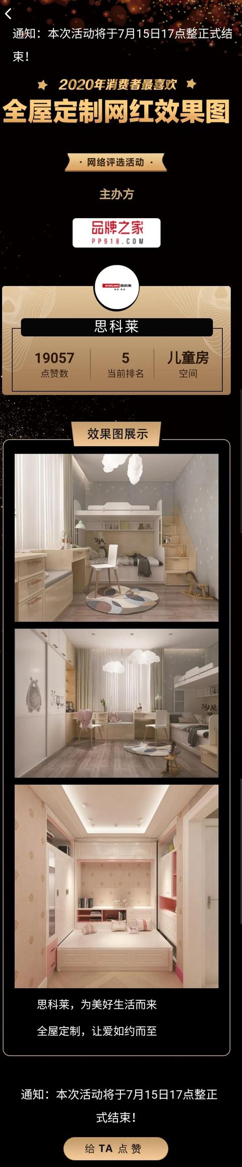 由品牌之家举办的“2020年消费者最喜欢全屋定制网红效果图”网络评选活动榜单于2020年7月份震撼揭晓!在本次活动中,“思科莱”健康+整装荣获“2020年全屋定制网红效果图(儿童房)十佳品牌”荣誉称号。