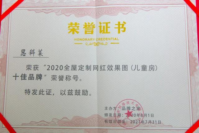喜讯!思科莱荣获“2020年全屋定制网红效果图(儿童房)十佳品牌”。
